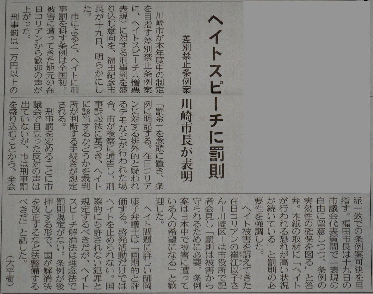「川崎市が、ヘイトスピーチを繰り返す者に刑事罰を科す方針を示した。行政罰としての過料を命じる条例はこれまでもあったが、刑事罰を盛り込んだ案は初めてだという。国や自治体にヘイトスピーチ解消の取り組みを求める対策法が2016年に施行され、各地での動きが広がりつつある。」