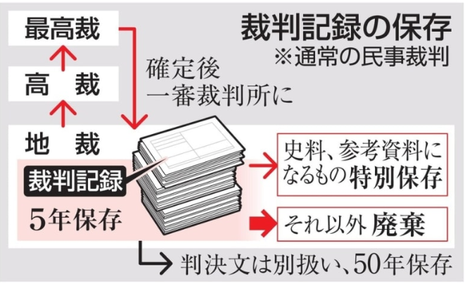 裁判所の規定は重要裁判記録の保存を義務づけ、専門家は違反の疑いを指摘する。著名裁判記録の廃棄は東京地裁で一部判明していた。」