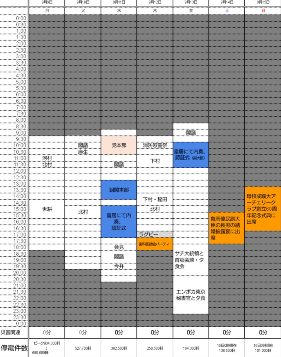 首相動静からまとめた安倍晋三のスケジュール(2019/9/9-9/15)