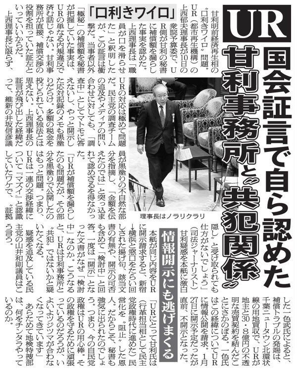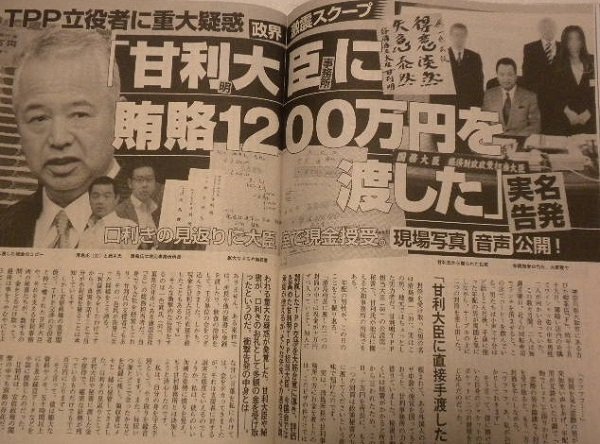 「甘利明・TPP担当相と公設秘書が、千葉県内の建設業者から口利きの見返りに現金を受け取りながら、政治資金収支報告書に記載していなかったとの疑惑を、1月21日発売の週刊文春が報じることがわかり、政界に衝撃が走っている。」